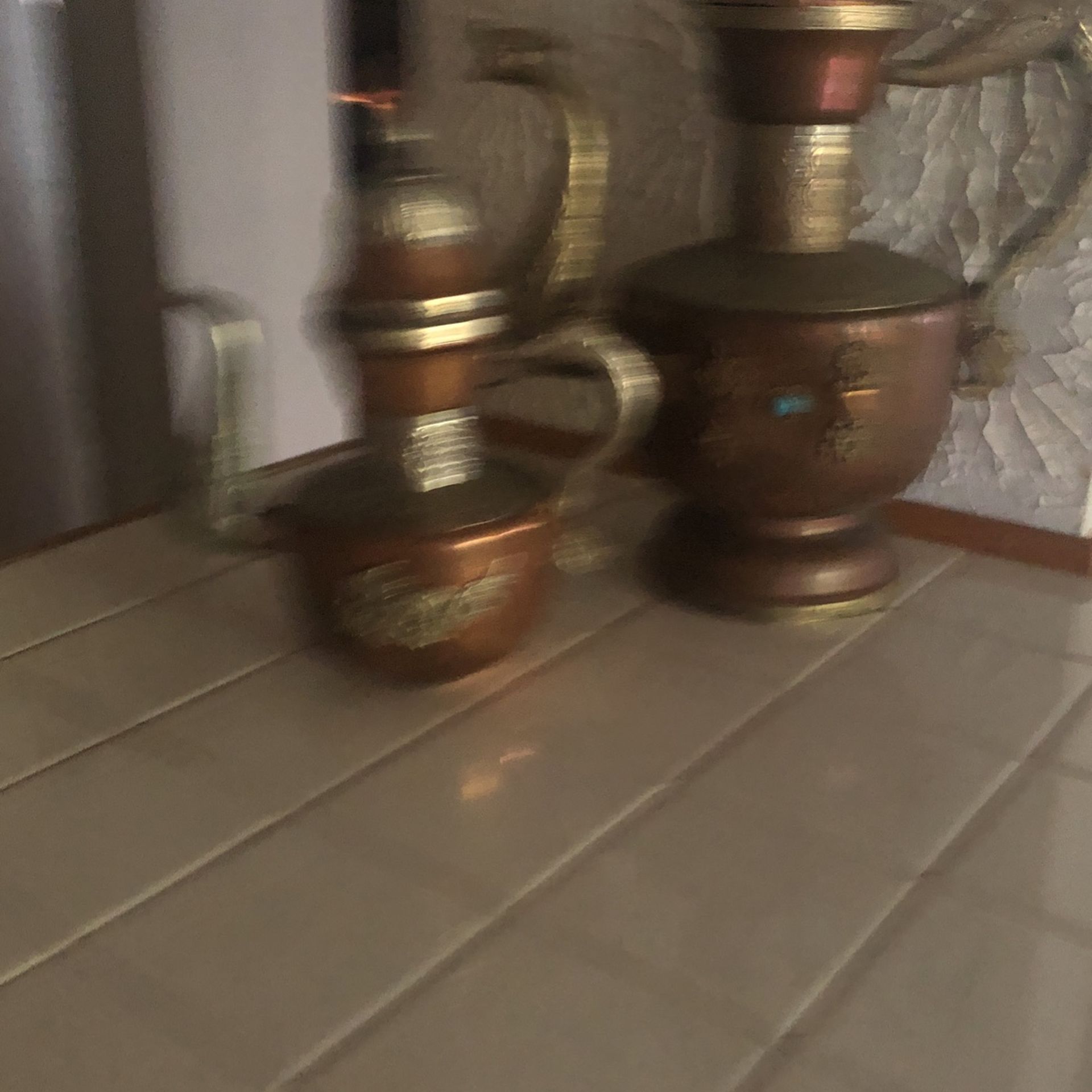 Antique brass kettles originally from India. Rustic brass finish with silver accents.