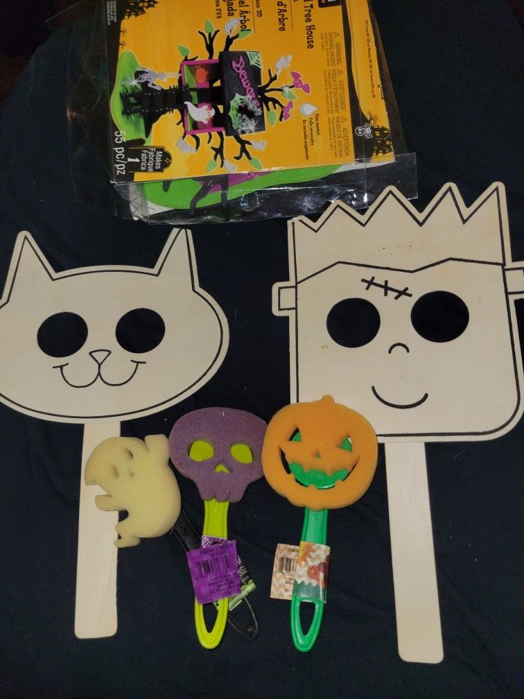 Halloween Craft Kit INCLUDES: 2 wooden mask-paintable 3 spooky shaped sponges to paint with Haunted Tree house kit $5 pick up only 51st ave and Maryland **please check out my other items for sale, thanks**
