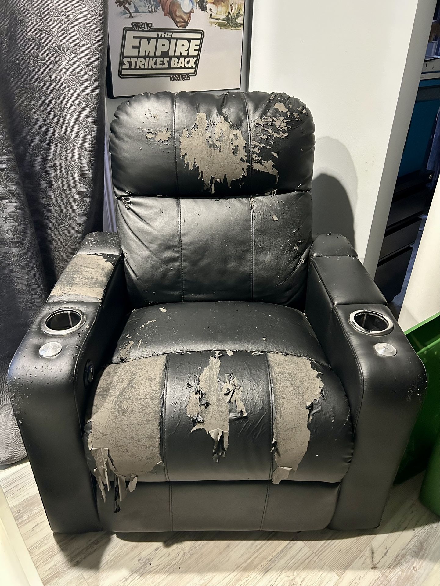 (5) Center Chair Pieces (6) Arms Leather is peeling but they sell stretchy covers that fit them. Super comfortable and they have USBs, recliner buttons, cupholders, trays, and cubbies for remotes/snacks, etc. Very heavy and you will need to load them. You can take them all or choose which ones you want.