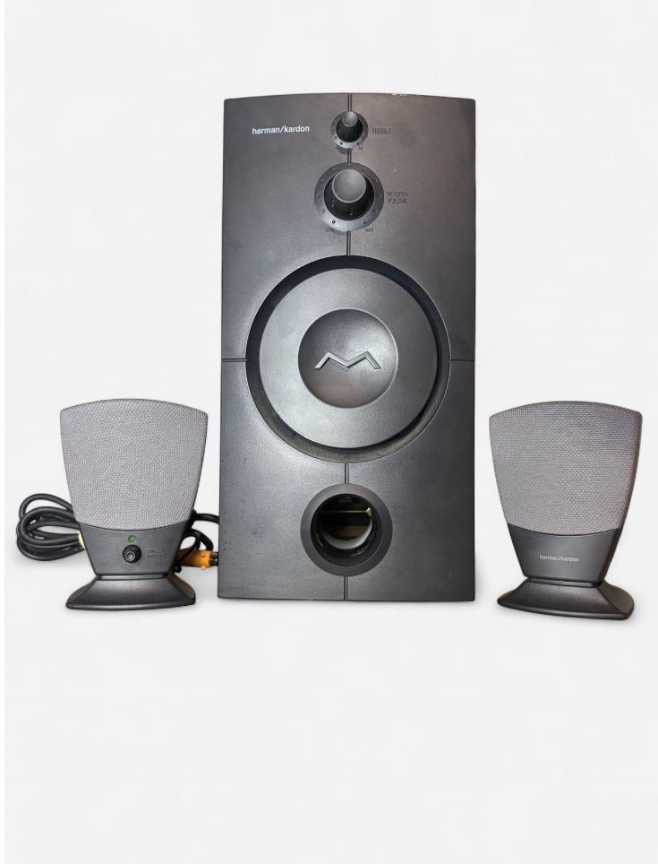 # Harman Kardon Speaker System with Subwoofer *Description:* For sale is a Harman Kardon speaker system with a subwoofer, exactly as shown in the photos. The system is in good condition and comes with everything you see in the pictures *What's Included:* - 2 Satellite Speakers - 1 Subwoofer - All necessary cables *Condition:* Good condition, with minimal signs of wear. *Notes:* - Sold as-is, but comes with everything needed for a great audio experience. Thanks for looking!