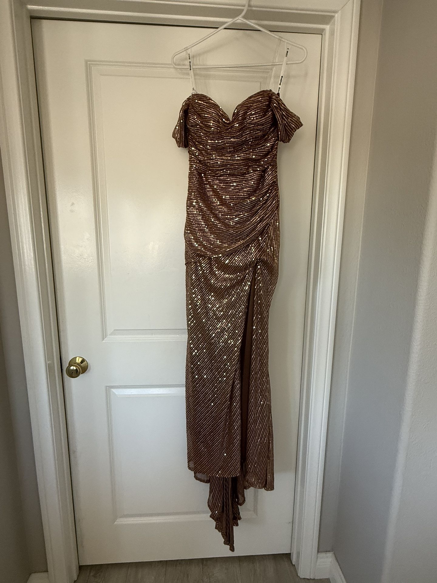 Brand new dress size 6. Long with slit on the side straps can be worn down or up, this dress retails for $500.