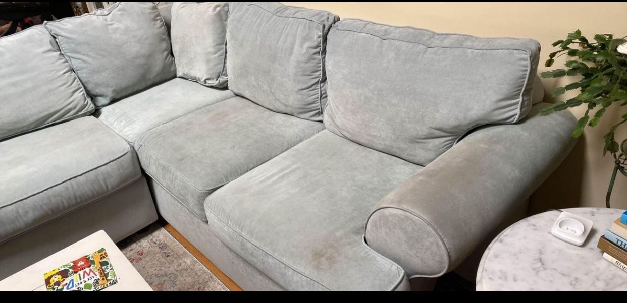 Sea foam green, washable. Has some stains would probably come out after washing.