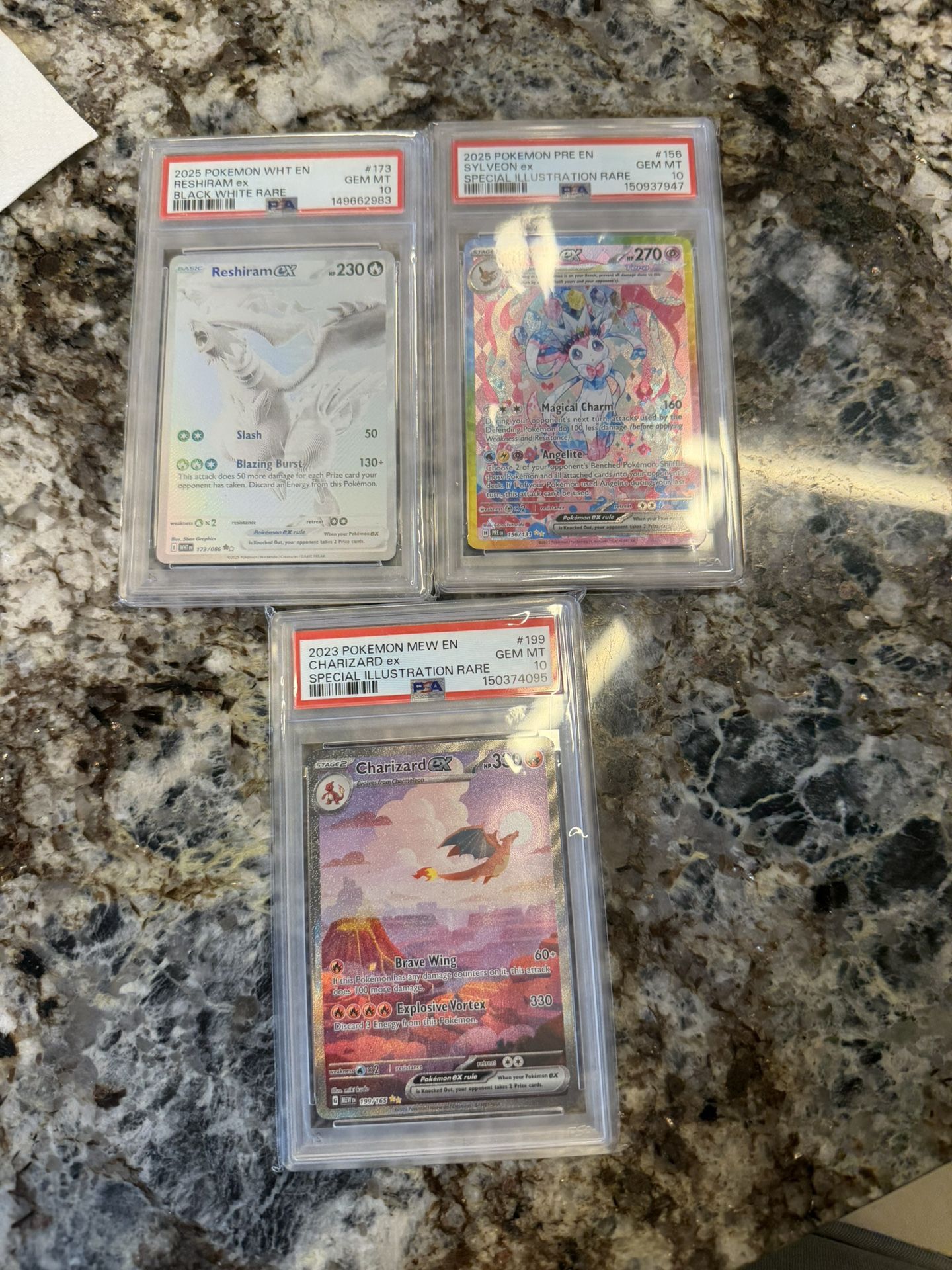 A few slabs for sale SOLD - PSA 10 Sylveon ex #156 SOLD - PSA 10 Reshiram ex #173 $2000 - PSA 10 Charizard ex #199 151 White flare Prismatic evolutions
