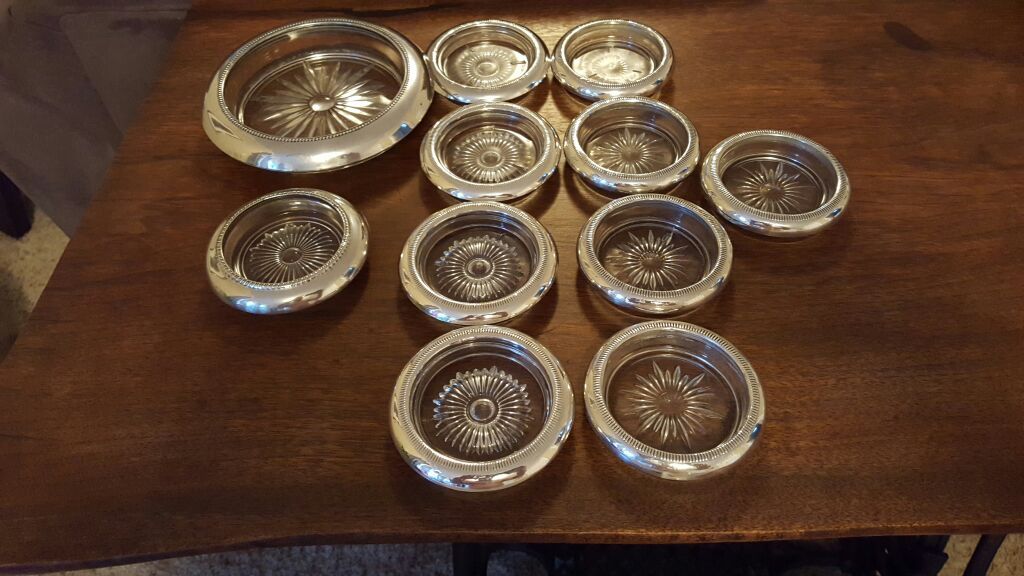10 Vintage Sterling Silver and Glass Coasters! (large not currently included) Average condition, small nicks dents but not terrible, 1 has a pliers mark or something as the worst damage, see picture.