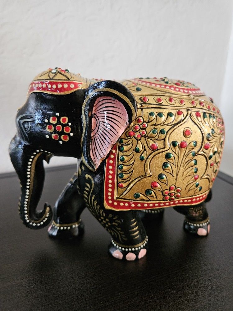 Beautiful hand carved and hand painted wood elephant. Brilliantly decorated in gold, red, and green design it features intricate designs, including floral motifs and mandalas, on the blanket and headdress. Elephants symbolize prosperity, good luck, wisdom, and strength. A trunk facing upwards is believed to shower good fortune upon the home. Perfect addition for anyone who loves elephants. Measures 5 inches tall. Can deliver in the New Haven area for an additional $5