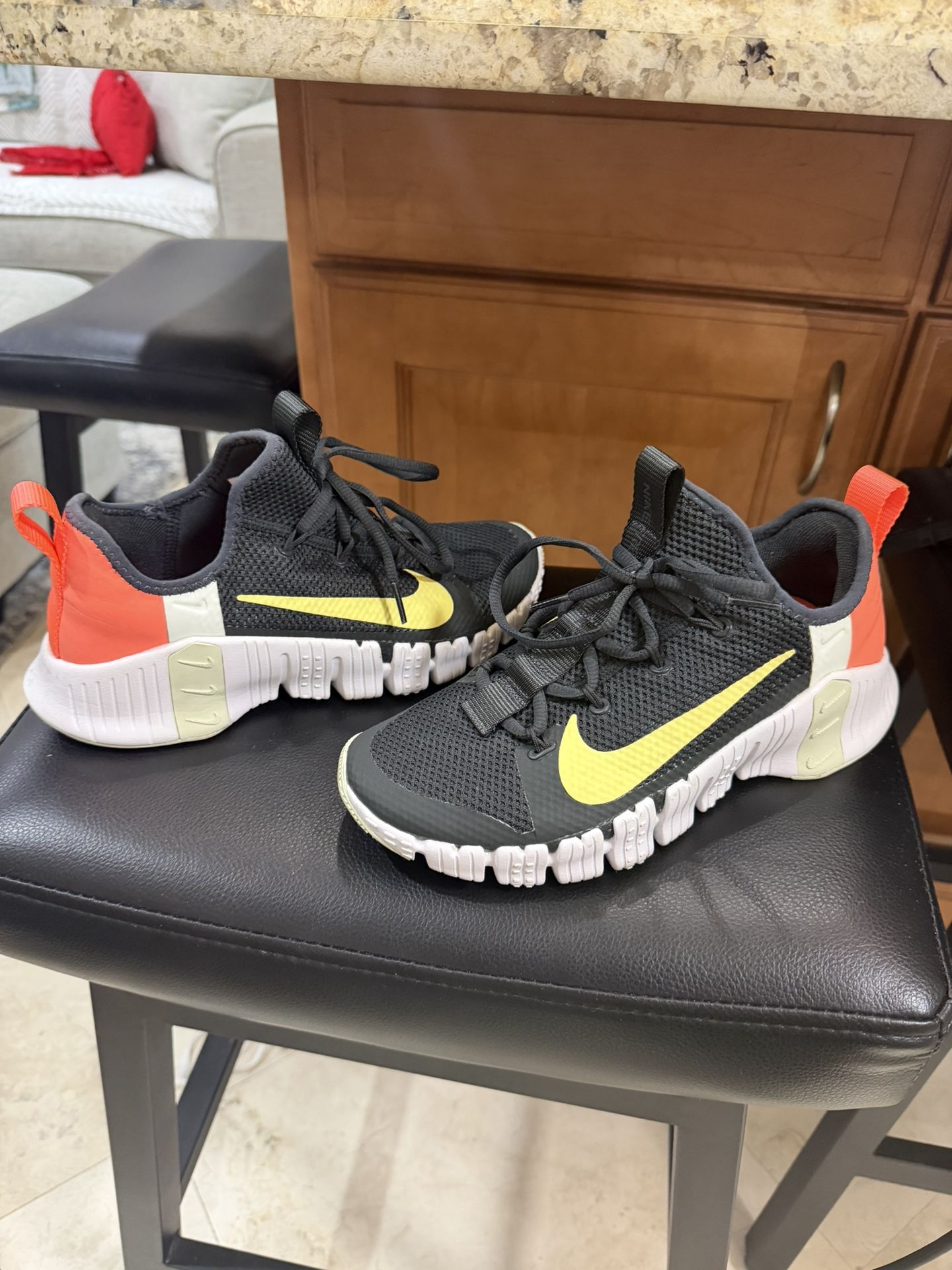 Women’s size 8. Like brand new. Only worn a handful of times. Nike Free Metcon 3 Black, White, and Bright Mango color. MSRP $120