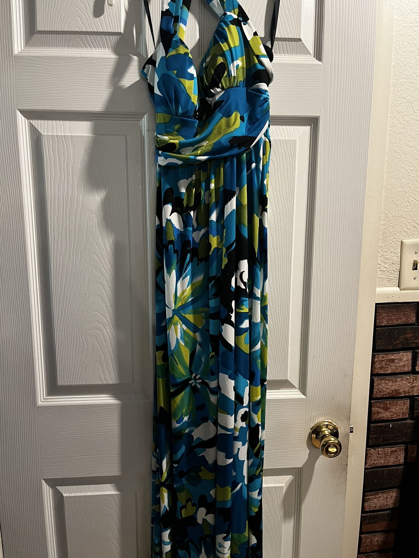 Blue , white, black and mustard color. Summer dress. Size 10 stretchy about sz M. Long in length.