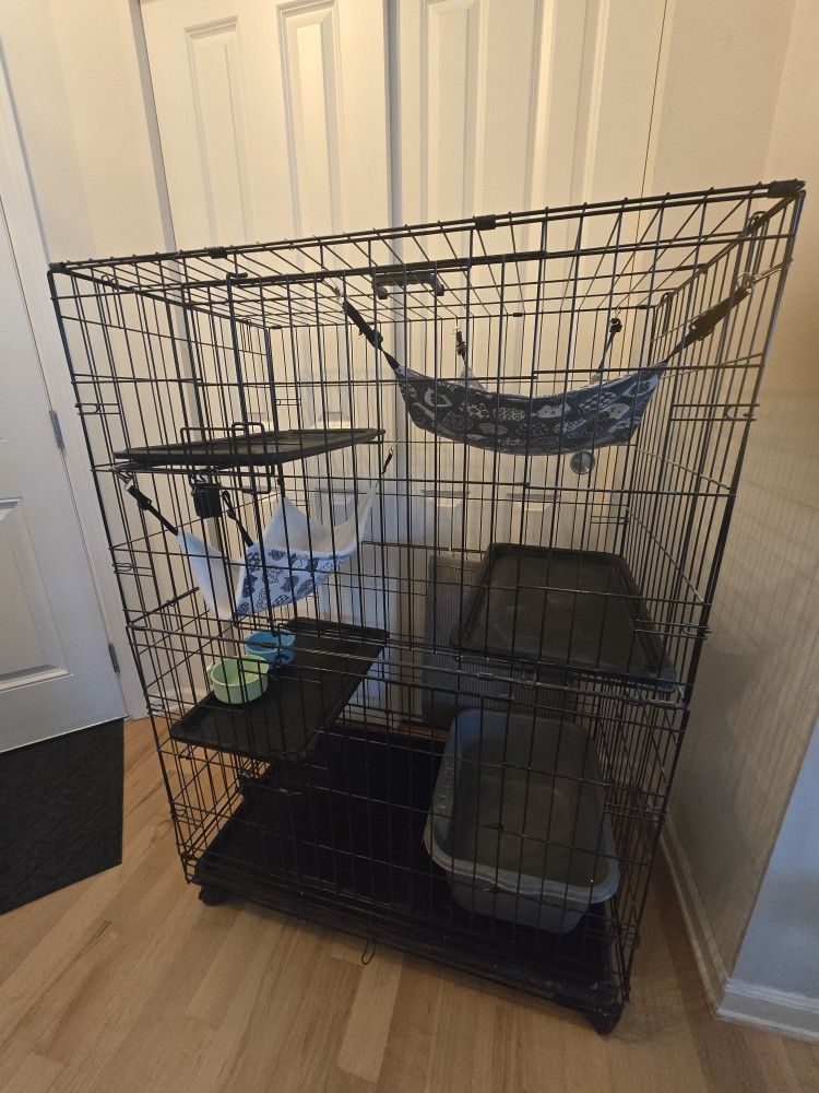 3 Tier Cat Condo With A Few Accessories. Used Only A Few Months For Foster. Porch Pickup Lake Stevens. Product Specs: Tall 3-tier indoor cat cage playpen provides cats or kittens with a safe place to rest or play Durable rust-resistant steel wire construction with secure-locking door latches and 1.36 inch bar spacing for safety Sets up quickly; 4 locking wheels for smooth maneuvering and secure placement; folds down flat for easy carrying and compact storage 2 swing-open doors for easy upper and lower interior access; 3 interior shelves offer vertical space for perching or napping; Removable leak-proof plastic floor pan for easy cleaning Product Dimensions: 35.8 x 22.4 x 50.6 inches (LxWxH)