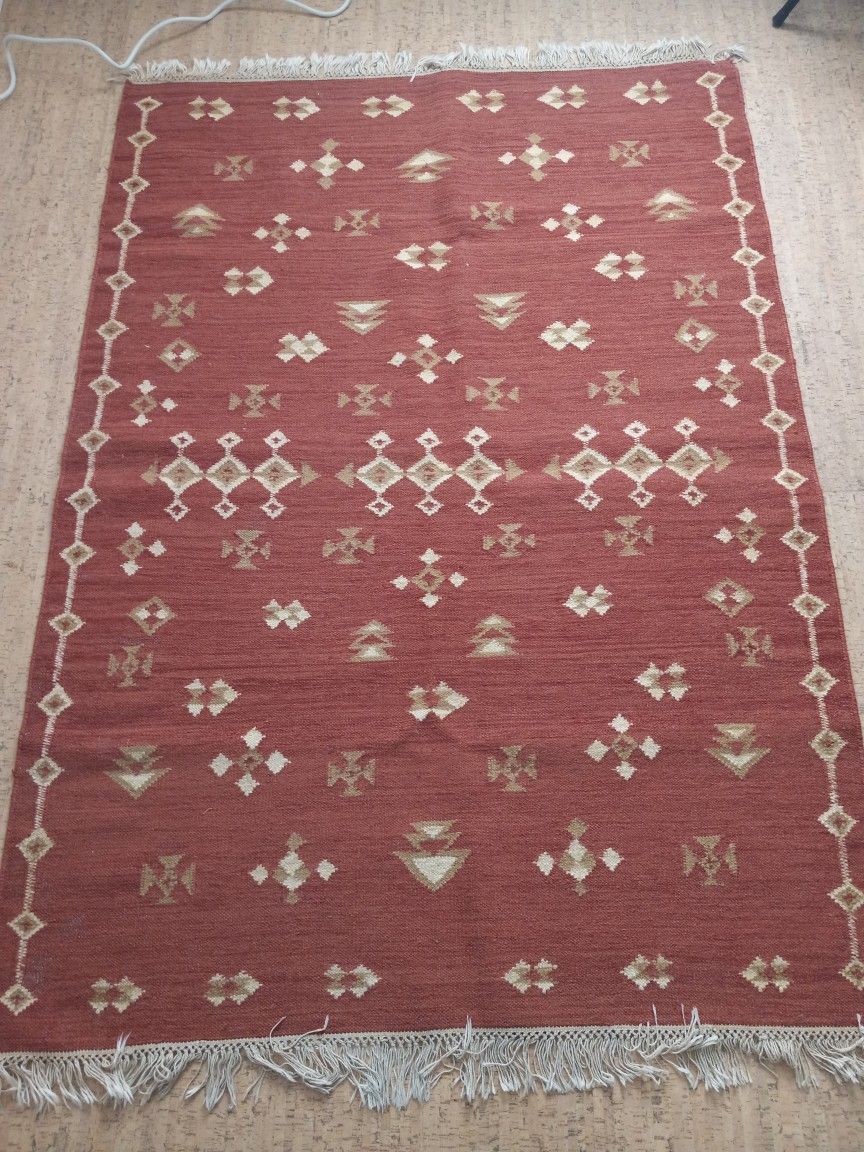 Bought but never used. Just sat there, folded. 4ftx6ft with some dust due to it sitting in the corner of the closet folded all these years
