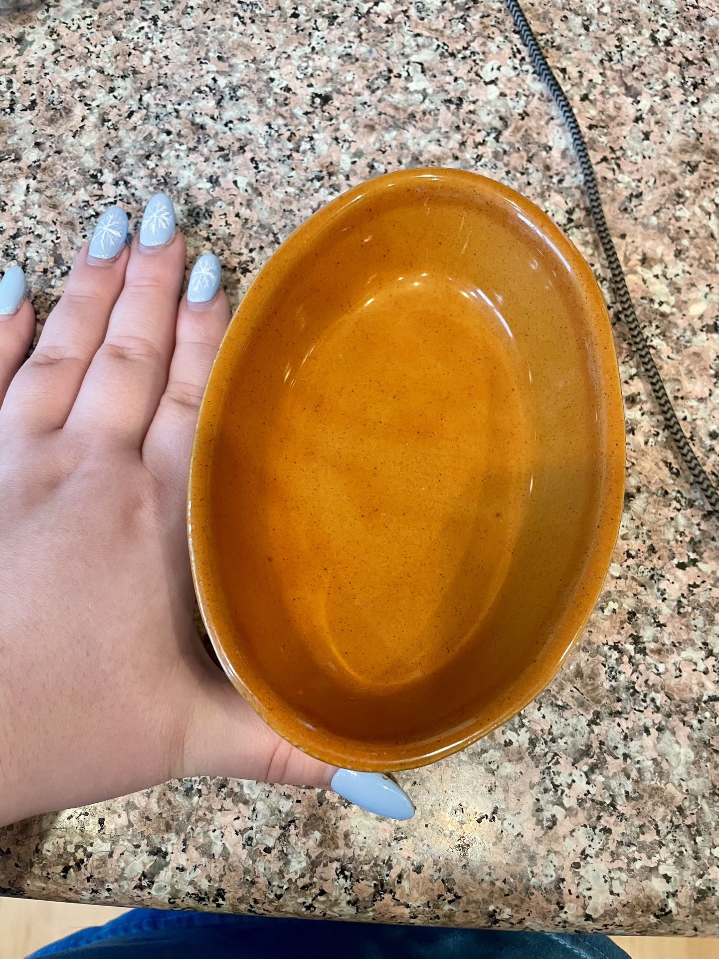 Euc Small splatter on the edge, pictured Brown/orangey glaze Small oval shape Candy dish, single serve baking/roasting dish, dip/spread bowl, etc