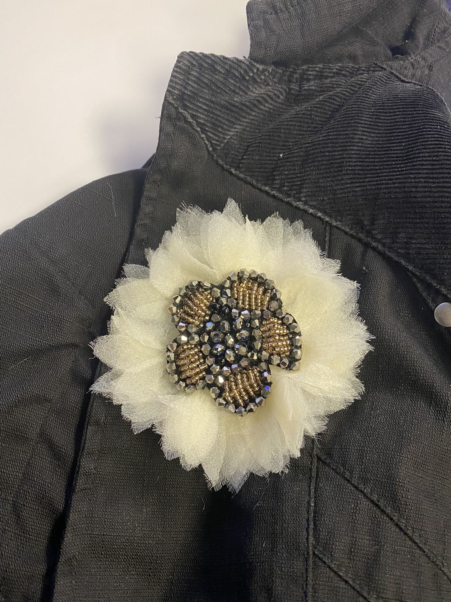 Floral brooch made of sheer fabric and glass beads