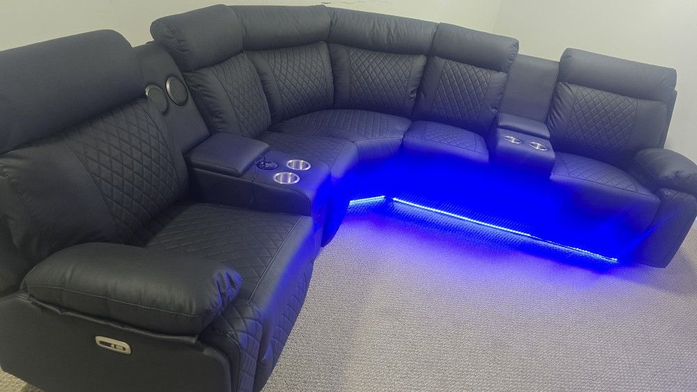 Brand new sectional too big for basement. Led and bluetooth automatic recliners charger ports etc
