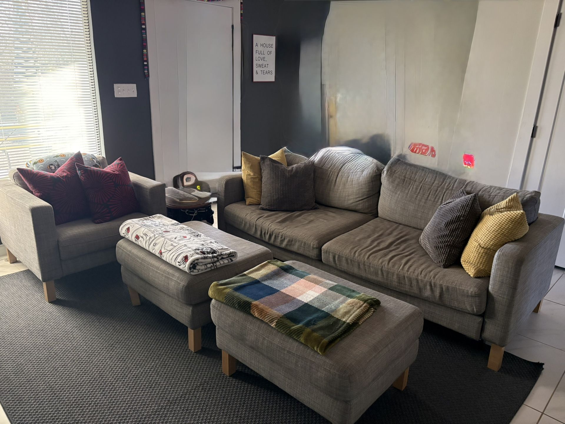 Ikea sofa & ottoman’s with pillows about 10yrs old. Opens to a full size trundle bed. No pets very clean non smoking home. Normal wear. $300 or negotiable.