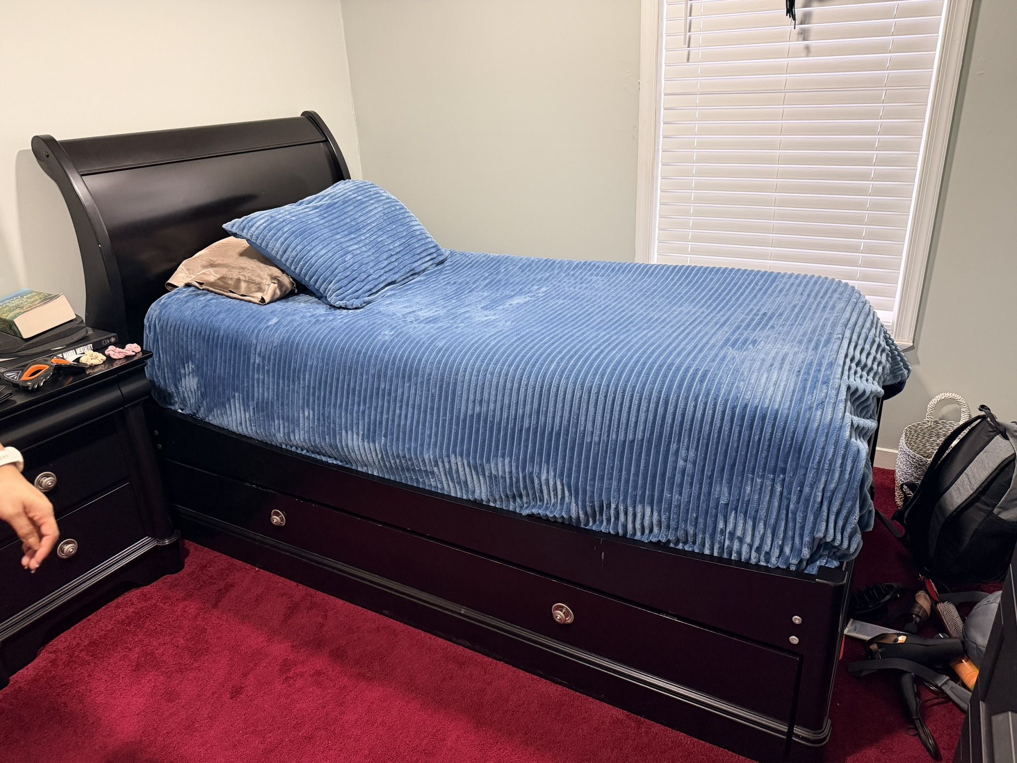 Twin size trundle bed with two beds and matching nightstand. Solid and sturdy, dark wood finish with normal light wear from normal use. Fits standard twin mattresses. Great for a kids room or guest room. Pickup only.