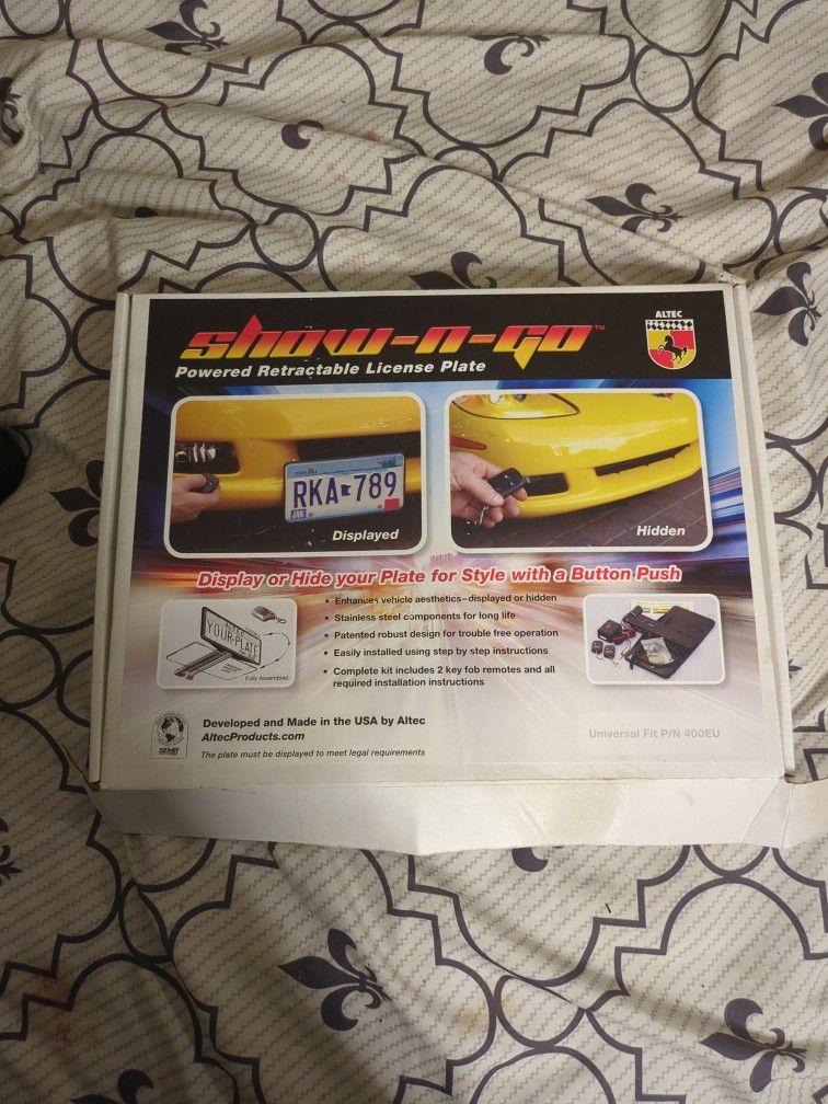 This little contraption takes your front license plate you attach it to it and then when you push the button it'll take it off the front of your car and roll it underneath the front of your car so it hides it it's for a bunch of different reasons I'm not quite sure why a person wants to hide their license plate but it's got two key fobs a little power box that connects right to your battery it's got a little you know whatever you call that transducer or transgender or whatever and then it's got step by step directions and it looks pretty interesting I couldn't quite figure it out but all the parts and pieces are there and I'm asking 20 bucks for it and I live in Lakewood thank you very much