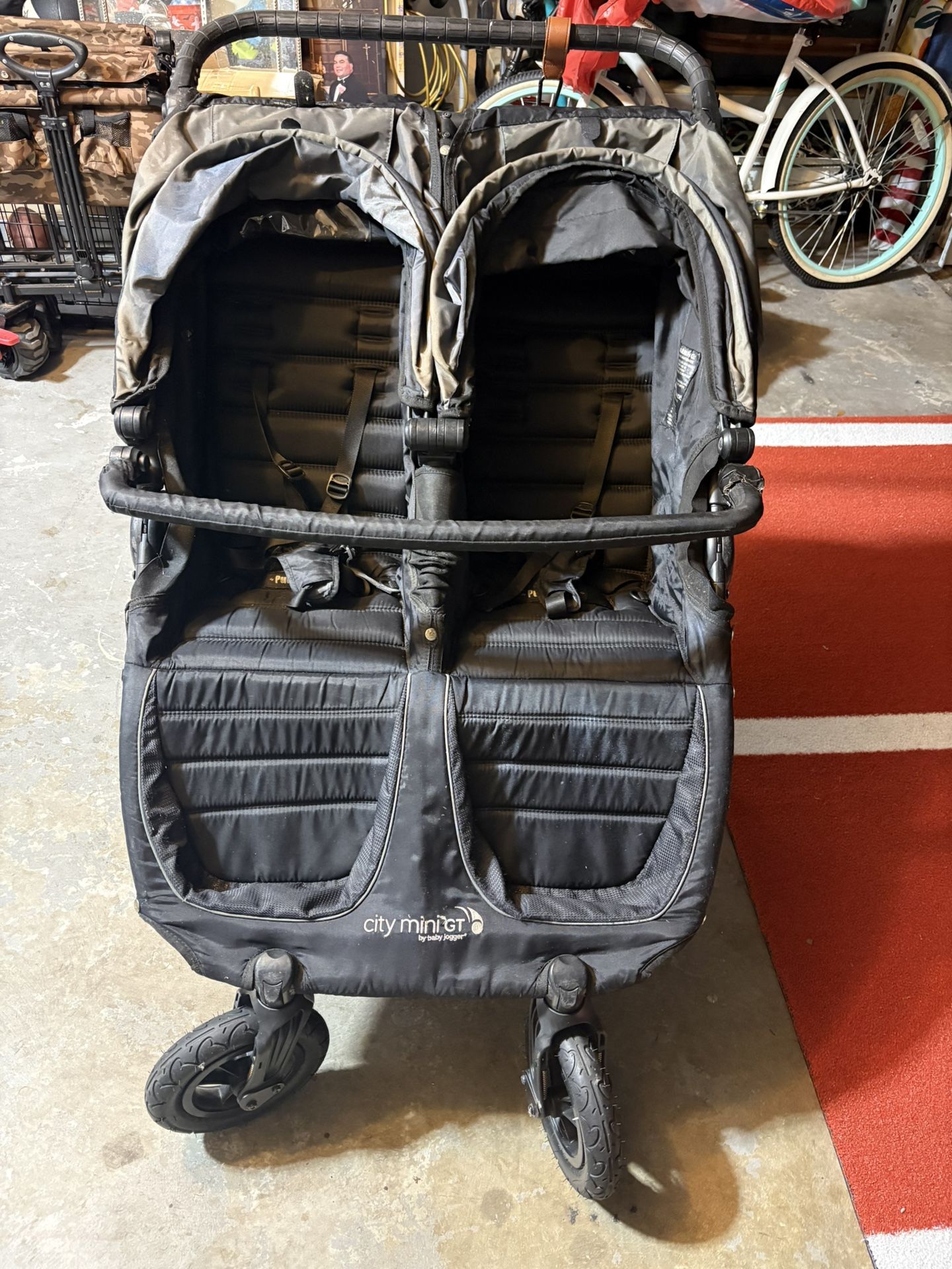 Great condition City Mini GT Double stroller by Baby Jogger. Super smooth ride and easy to maneuver, even one-handed. Perfect for twins or siblings close in age. Features: • All-terrain wheels with suspension (great for sidewalks, parks, and uneven ground) • Lightweight and easy to push for a double stroller • One-hand, quick fold • Adjustable canopies with peek-a-boo windows • Reclining seats for naps on the go • Large storage basket underneath • Padded seats with 5-point harnesses • Front swivel wheels that lock for stability Stroller is clean, structurally solid, and ready to use. Normal wear from use, but nothing that affects function. Perfect for everyday errands, walks, or travel.M