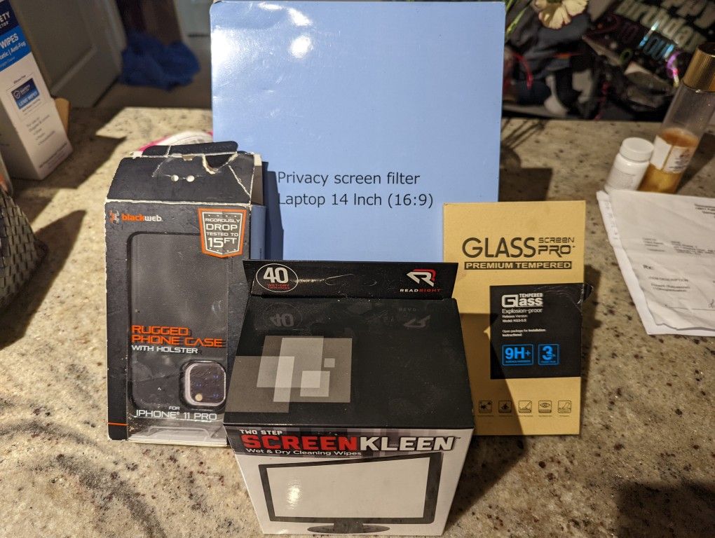 2- Screen Kleen - wet and dry cleaning wipes 2 - Privacy screen filters . Fits 14inch Laptop 1- Tempered Glass Pro Screen Protectors . 1 - Black Web rugged phone case with holster