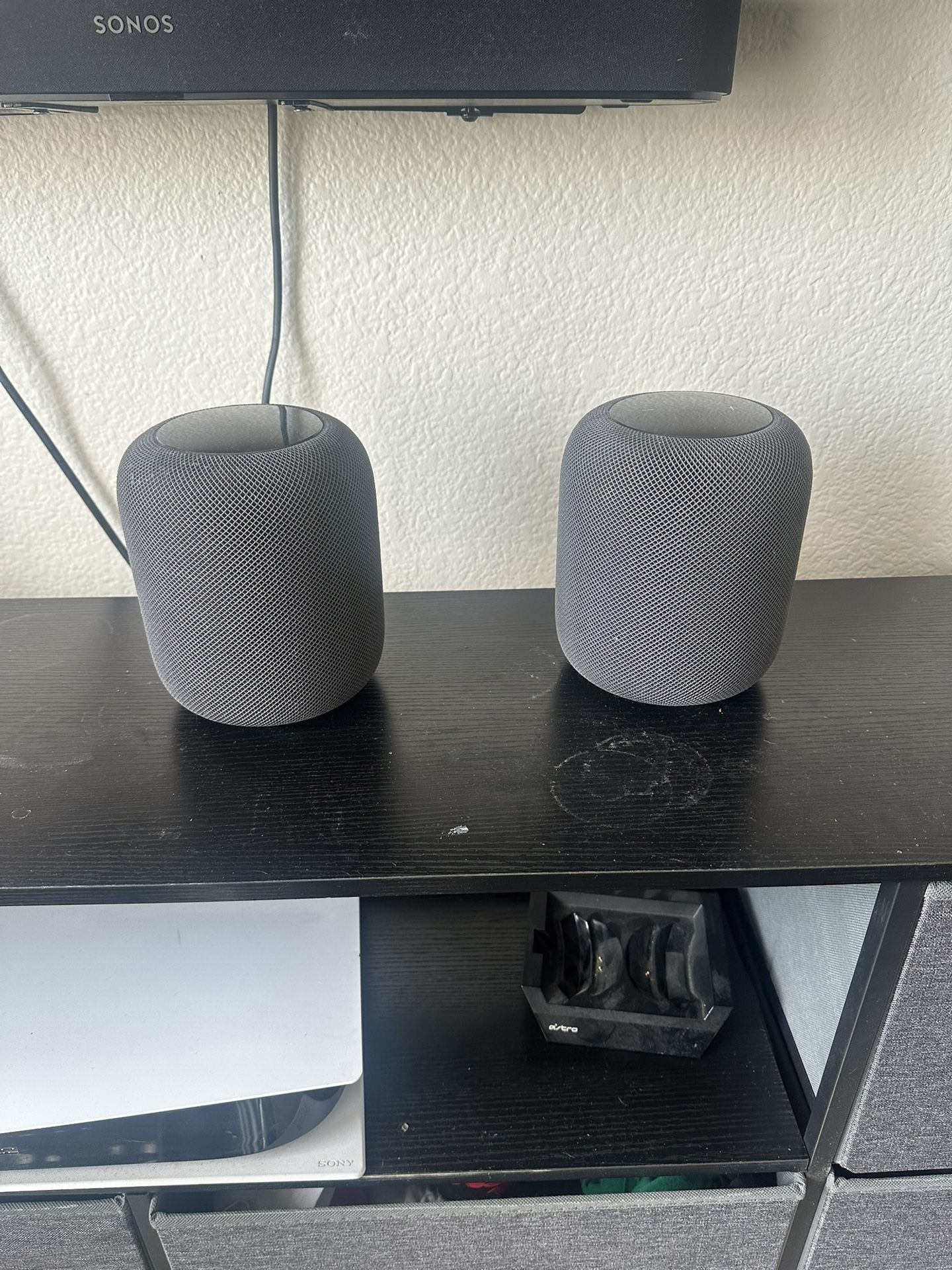 2 lightly use 1 Generation HomePod Speakers works great no issues. Use both for surround sound speakers. $180 each or both for $350!!!