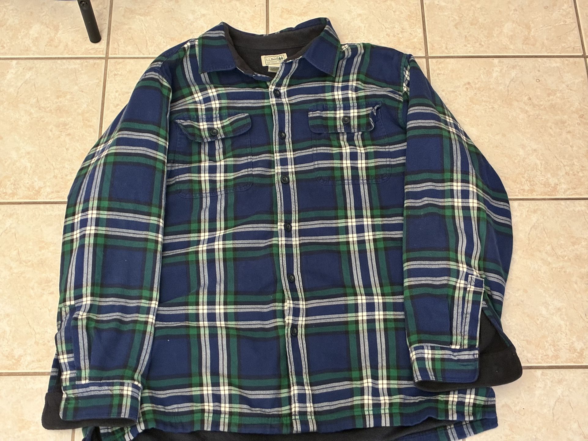 L.L. Bean flannel shirt jacket in good pre-owned condition. • Size: XL (Regular) • Classic blue/green plaid pattern • Heavyweight flannel outer with soft fleece lining • Button-up front with dual chest pockets • Great for layering / workwear / outdoor use Condition: • Overall good condition • Light wear from normal use • No major stains or holes visible Measurements (approx): • Pit to pit: ~25 inches • Length: ~31 inches Material: • Shell: 100% Cotton • Lining: 100% Polyester Authentic L.L. Bean quality piece — durable and warm. See photos for details and measurements.