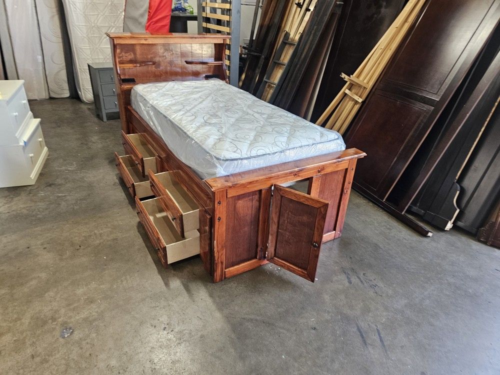 Twin captains bed Solid wood Mattress Included 4 drawers And storage $260 Firm price Delivery available for extra fee