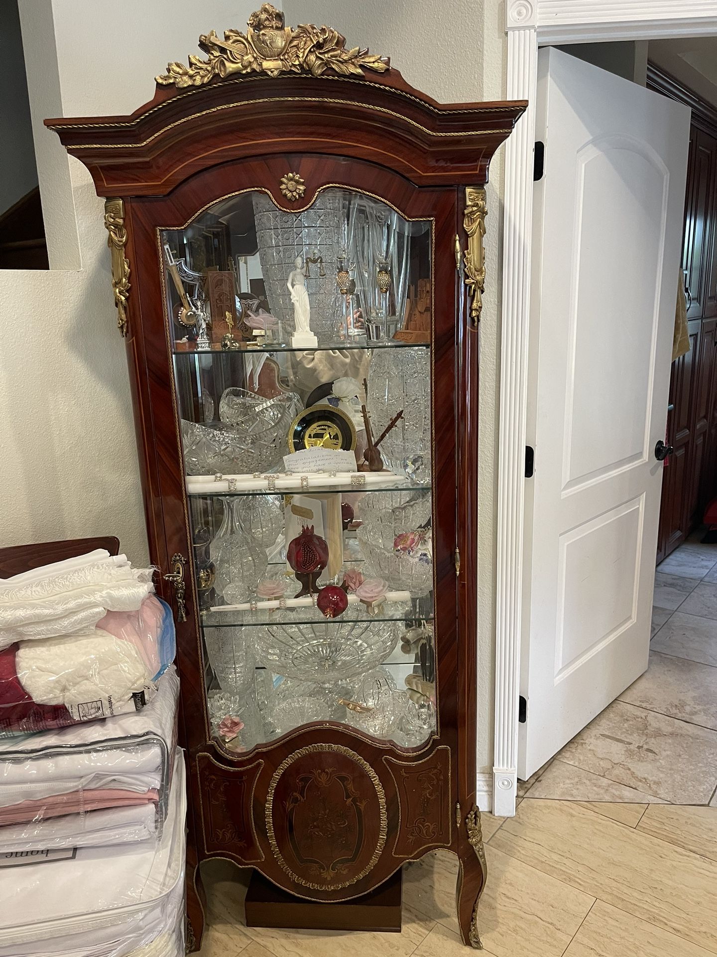 Antique chest with gold accents Bottom storage Key opening Mirror inside 3 shelves
