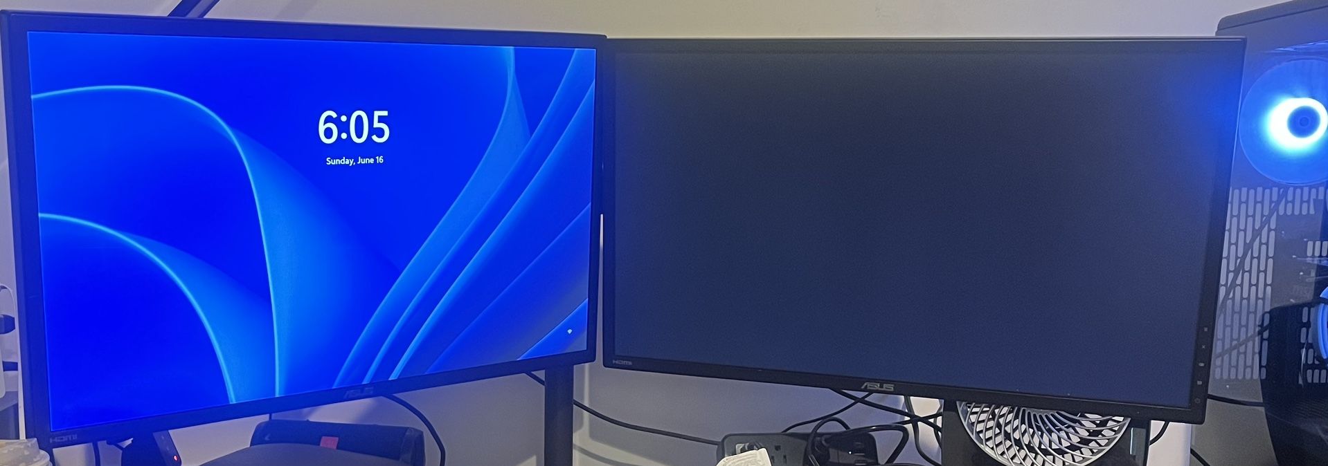 I’m selling two asus 24” monitors vg(contact info removed)p 60 hz . One only have the standing arm. One has a scratch on it . Check the picture.