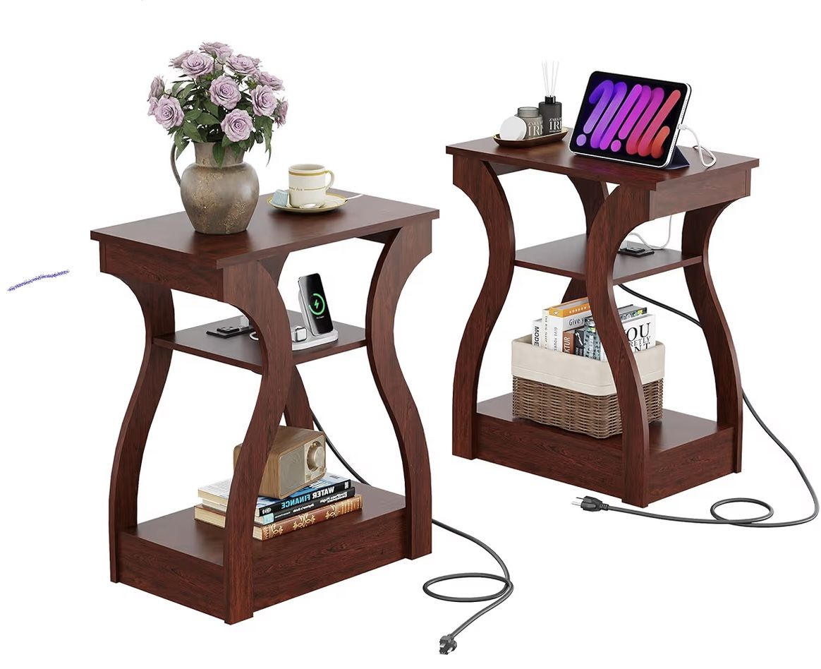 Brand new End Tables Living Room Set of 2, Cherry Side Tables with Charging Station, Nightstand for Bedroom, 3 Tier End Table with Storage Shelf, Side Table Set of 2 for Living Room, Cherry Color