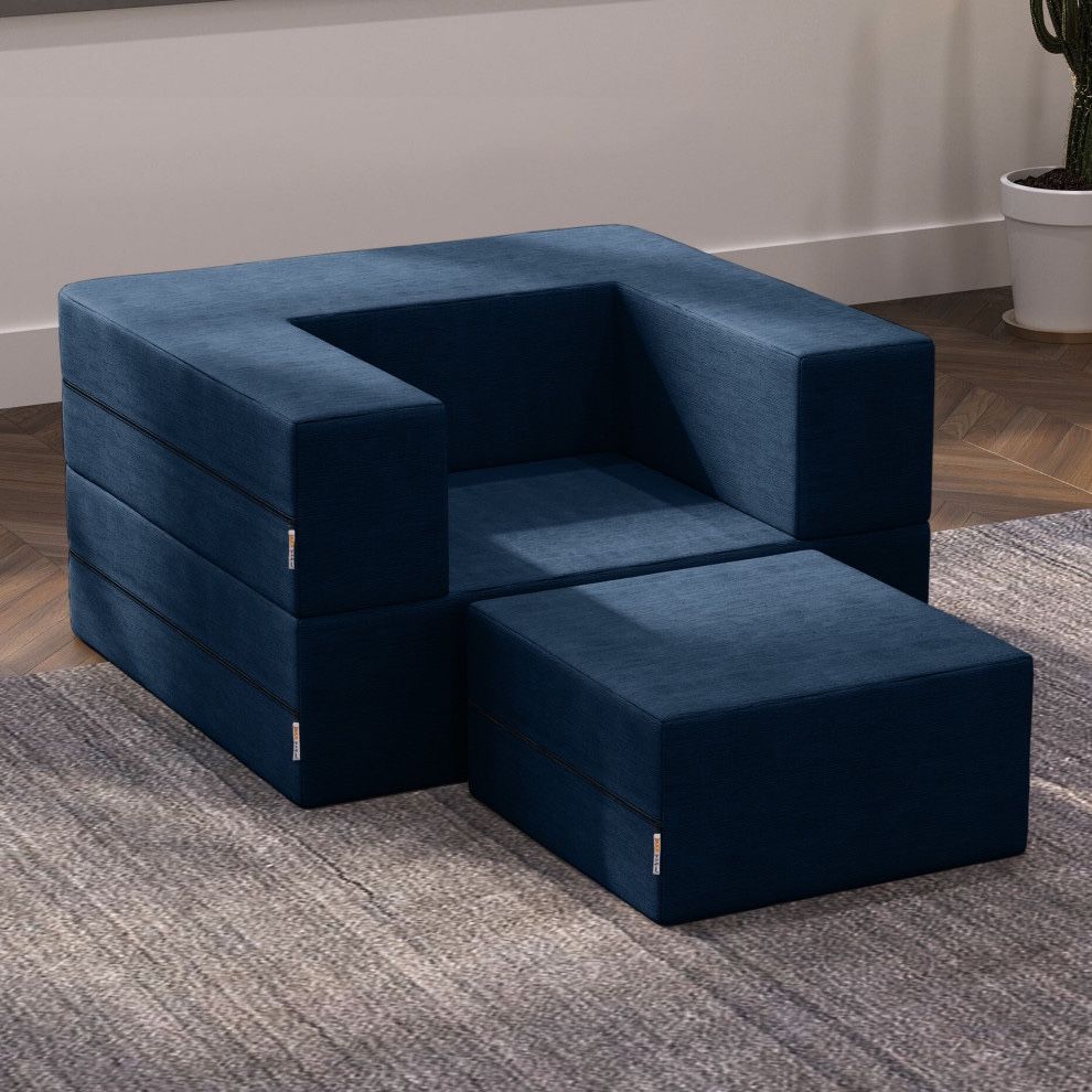 In color indigo. Excellent condition. Retail price $500 selling for $100 Details: Add versatile comfort to your space with this convertible sleeper chair. The chair is crafted from supportive, highly durable polyurethane foam, folded into a square shape with a back and arms that wrap around the seated individual. The ottoman fits snuggly into the seat cutout, allowing you to convert the chair into a stool or table when folded, or a twin-size bed when unfolded. Features: Convertible sleeper chair with matching ottoman Folds into a twin-size bed or a stool Includes mattress liner with childproof zippers, and removeable cover Covers are machine washable Filled with comfortable, supportive, and highly durable polyurethane foam Ships in compressed packaging to reduce shipping costs and environmental impact Once opened this product is non-returnable. Made in the USA with domestic and imported sewn textiles Dimensions: Chair: 37.5 inches long x 40 inches wide x 22 inches high Inner-Seat: 22 inches long x 22 inches wide x 11 inches high Twin-size bed: 75 inches long x 40 inches wide x 11 inches high Ottoman: 22 inches long x 22 inches wide x 11 inches high Country of Origin: United States