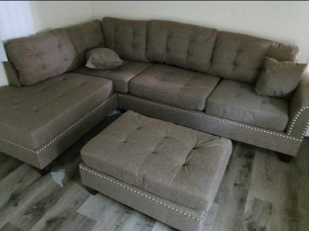 Also available in Blue(microfiber) Color:Coffee Material:microfiber Dimensions Overall: 104" x 75" x 35"H; Reversible L/R Chaise: 34" x 75" x 35"H ; Sofa: 70" x 34" x 35"H ; Cocktail Ottoman: 35" x 24" x 19"H Brand new in the box straight from distributor 6 month factory warranty included. Do offer delivery and assembly