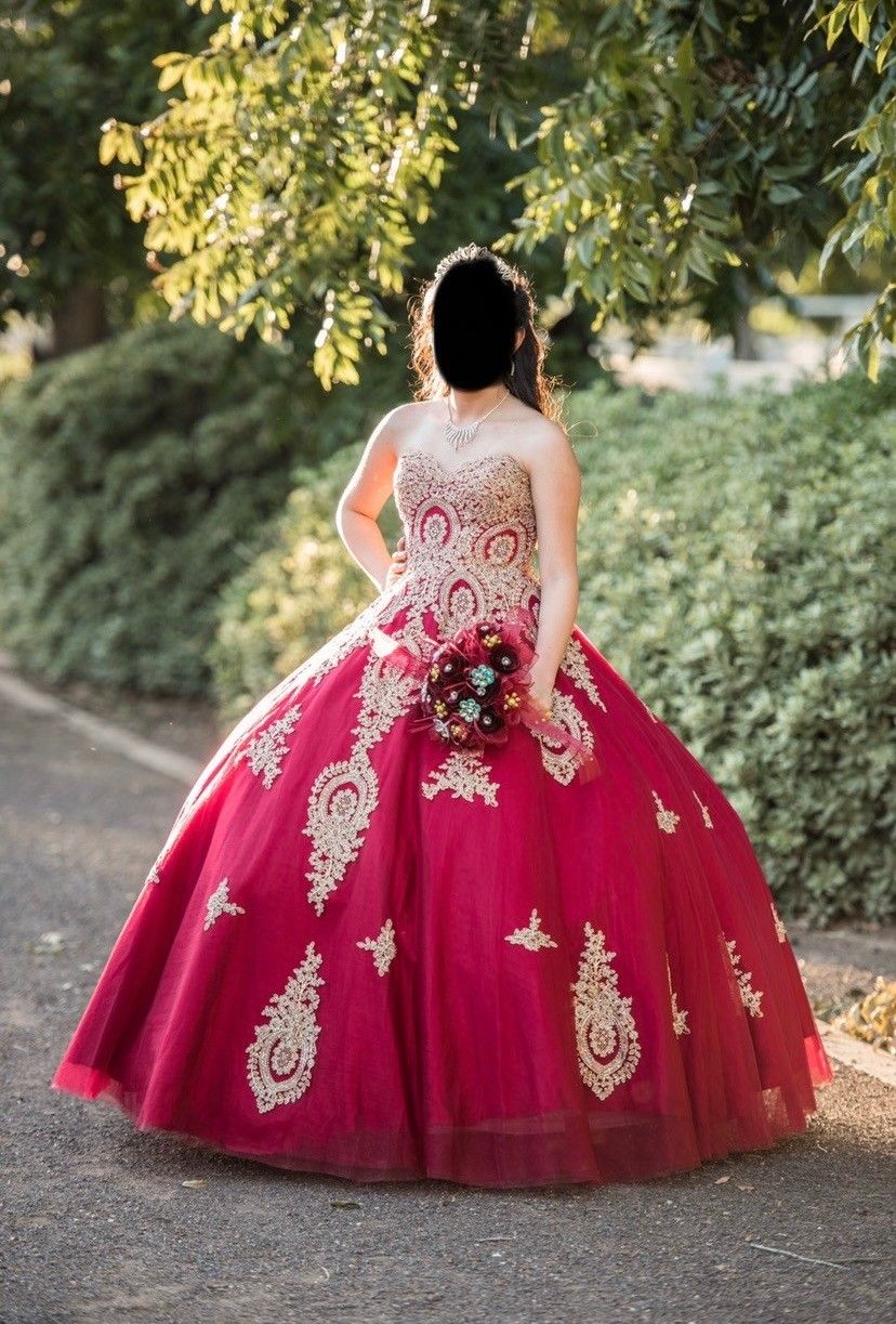 Beautiful maroon and gold details dress for sale. Comes with the hoop and bouquet. Small size. Hablo español.
