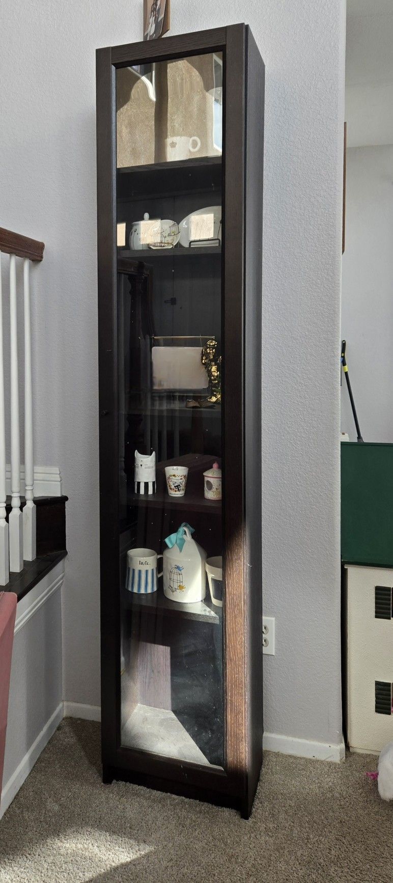 Tall dark espresso colored glass door cabinet with 5 movable shelves. Need a truck or large suv to pickup. Murrieta Cal Oaks 79" L X 15.5"w X 12" d