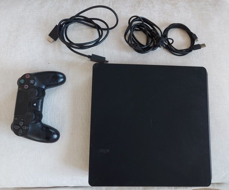 PS4 slim console complete with controller, controller charging cable, HDMI cable and power cable.
