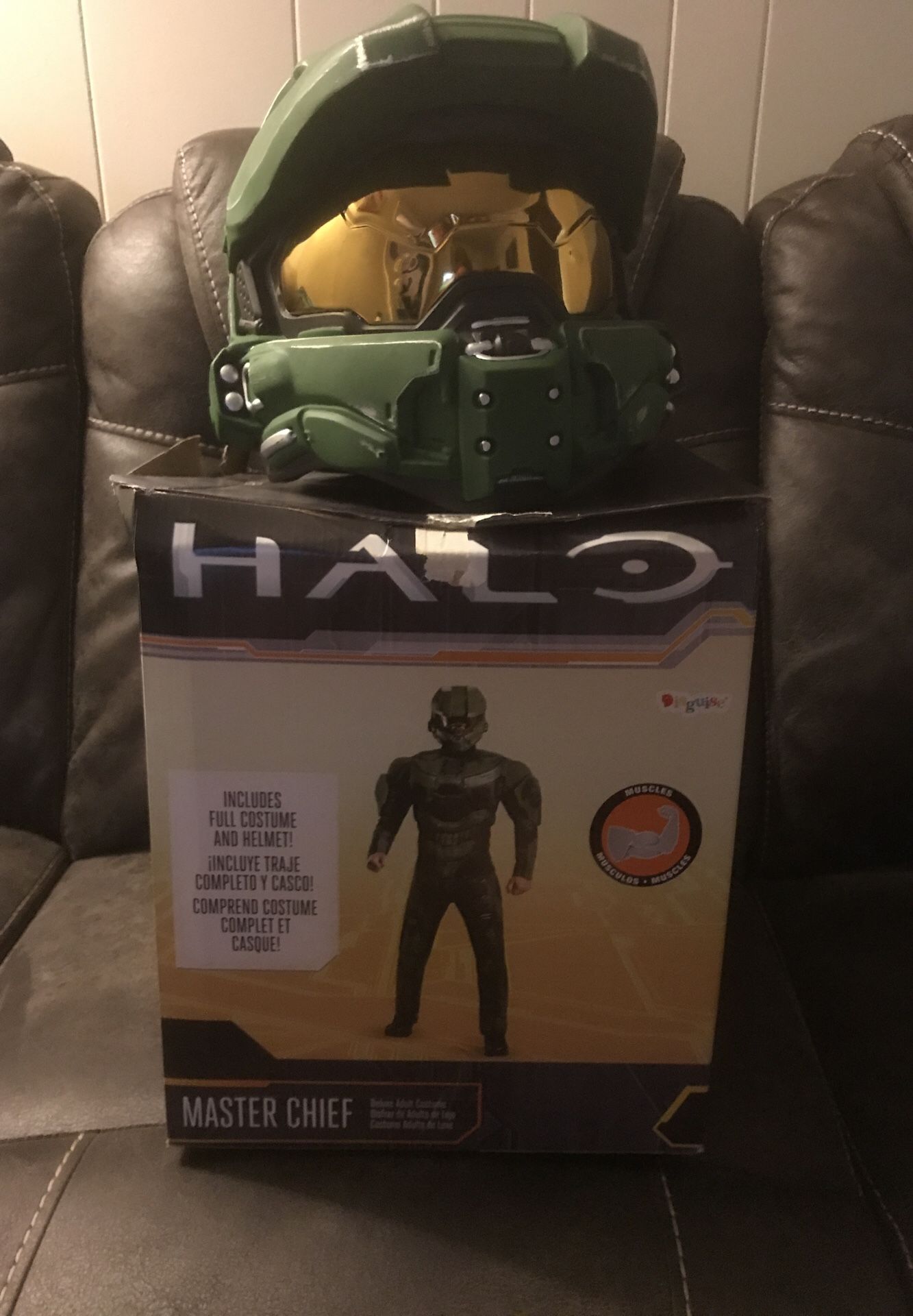 Adult size master chief halo costume includes prop gun I purchased separately. The costume and prop weapon ran me about $90 altogether. Pick up in Lakewood only