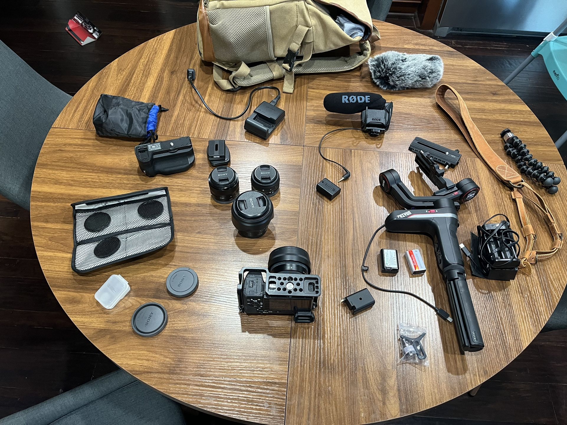 Full Camera/photography set Sony A6500 camera Sony 4/10-18 wide lens Sony 2.8/20 lens Sony 1.8/35mm Sigma 56mm 1:1.4 Weebull S Gimbal Rode Mic Charger 3 batteries Backpack Camera cage Tiffen Lens