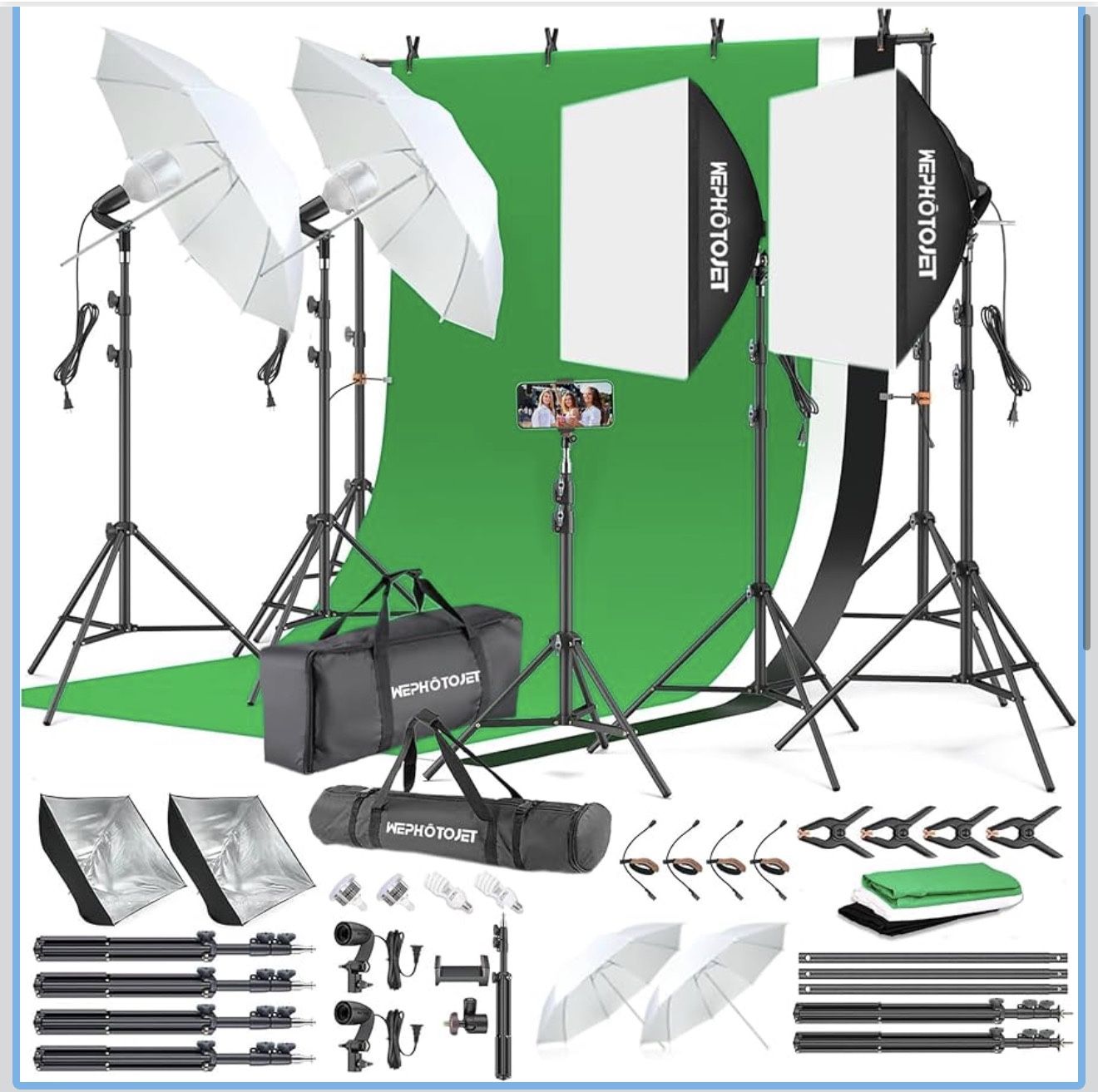 Photography Softboxes Kit with 8.5x10ft Backdrop Stands, 5 Tripod Stands, 3 Color Background Screen, Softbox with 85W Led Bulb, Photo Studio Equipment