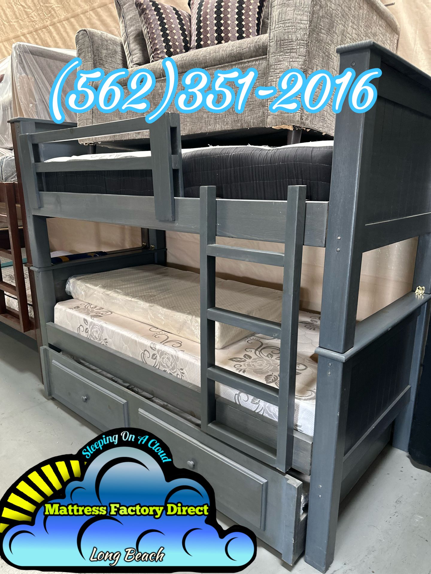 Triple grey bunk bed with twin trundle cama colchones nuevos