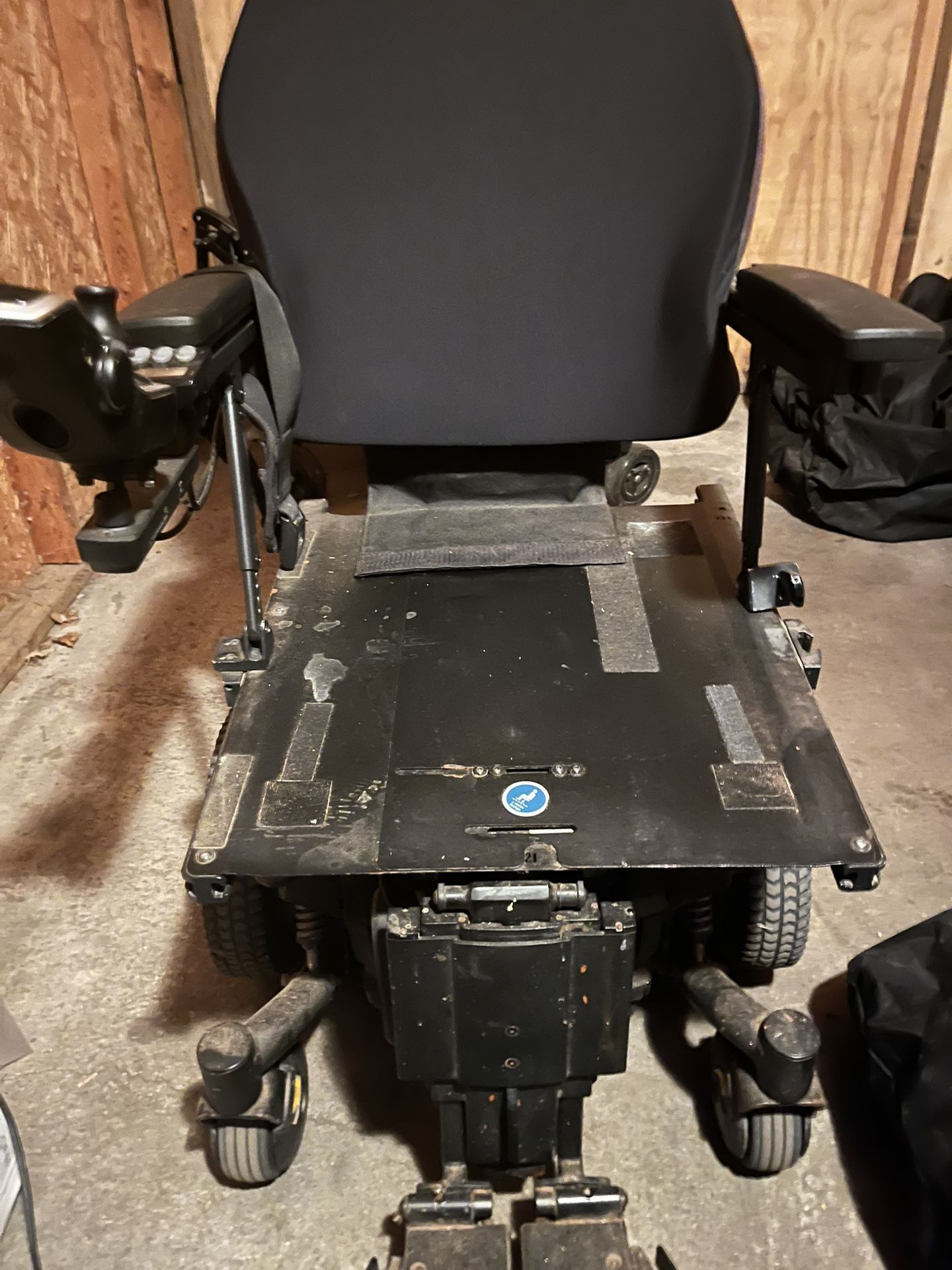 Selling a Quantum Edge electric power wheelchair (mid-wheel drive, power seating functions — tilt/recline/leg rest). It powers on and drives, joystick and controls respond, and motors work. The chair has definitely been used — there’s some cosmetic wear and dust from storage, and I don’t have the original charger.