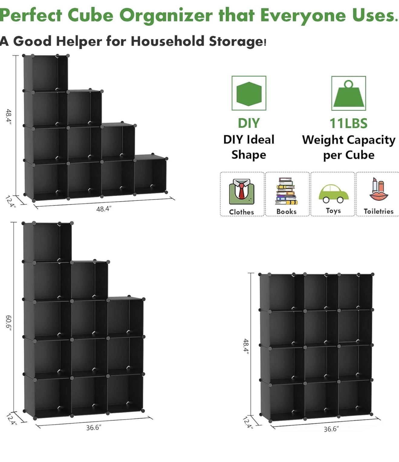 ENOUGH STORAGE SPACE : The storage cube has enough storage space, can store all sort of items what you want: such as books, clothes, toys, artcrafts, decorations and more, this storage unit is perfect for living room, bedroom, kids rooms, home office, cubby closet or entryway HIGH QUALITY MATERIAL: Our cube storage organizer is made of high quality PP materials, sturdy metal frame and ABS plastic connectors. Stable structure ensures that each cube can withstand a maximum weight of 11 lbs LARGER STORAGE SPACE: The size of each cube is 11.8 x 11.8 inch, providing large space to hold more things, the product size is 36.6”L x 12.4" W x 48.4" H, please note: it fits storage bins that is smaller than 11 x 11 inch