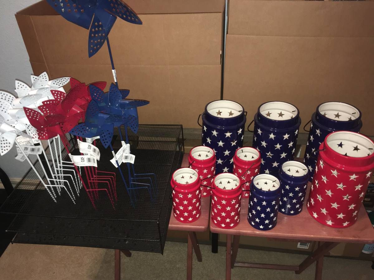 Selling everything together for $70. Everything is brand new. I have 16 windmills and 10 lanterns that are red, white, and blue colors. The windmills are metal a go for $9 each normally. The large lanterns go for $20 each and smaller ones go for $10 each normally.