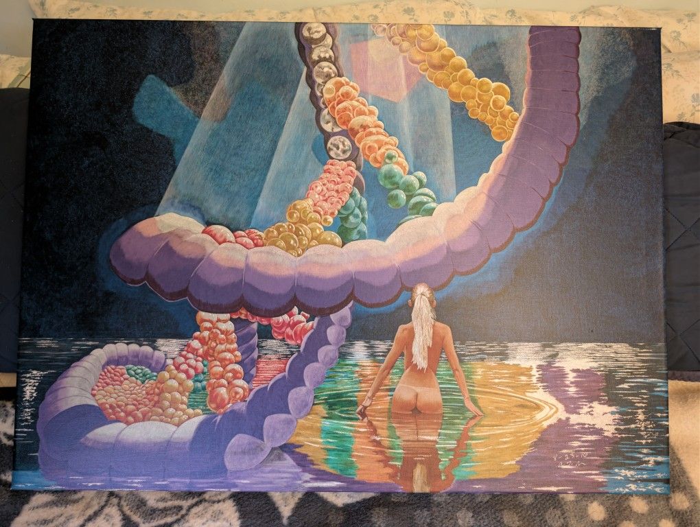 Selling a visually striking, original piece of art by Ascension T. Nelson, titled "The Gene Pool." This is a really unique, thought-provoking piece that beautifully combines scientific themes with classic figure work. I absolutely love this piece and it would make a fantastic focal point for a home office, studio, or gallery wall. I purchased this piece in 2018 in SLO at a local art show for $275. Details: Artist: Ascension T. Nelson Title: "The Gene Pool" -Medium: High-quality Prismacolor Pencils on Canvas. -Subject: A detailed composition featuring a large, colorful helix structure (like DNA or a chromosome) descending into a vibrant, reflective pool of water with a nude figure. -Condition: Excellent, ready to hang, framed on a canvas stretcher. -Size: 24" x 33" This is a chance to own original artwork, not a mass-produced print. The complexity of the Prismacolor work is amazing up close. Asking Price: $200 OBO Cash only, local pickup in Los Osos. Serious inquiries only! Please email or text with any question, thank you.