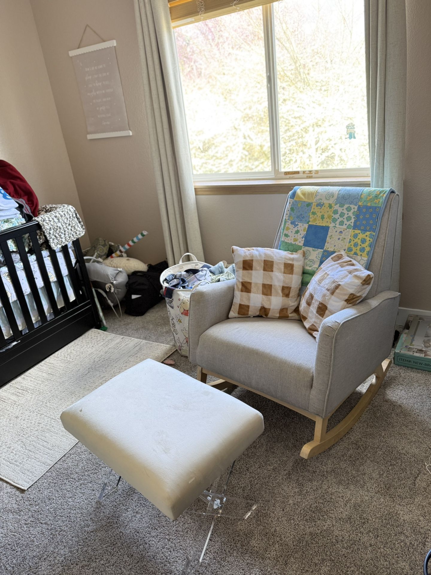 Cash only; barely used rocking chair and ottoman perfect for a nursery or general living area. Moving out of area trying to sell quick!