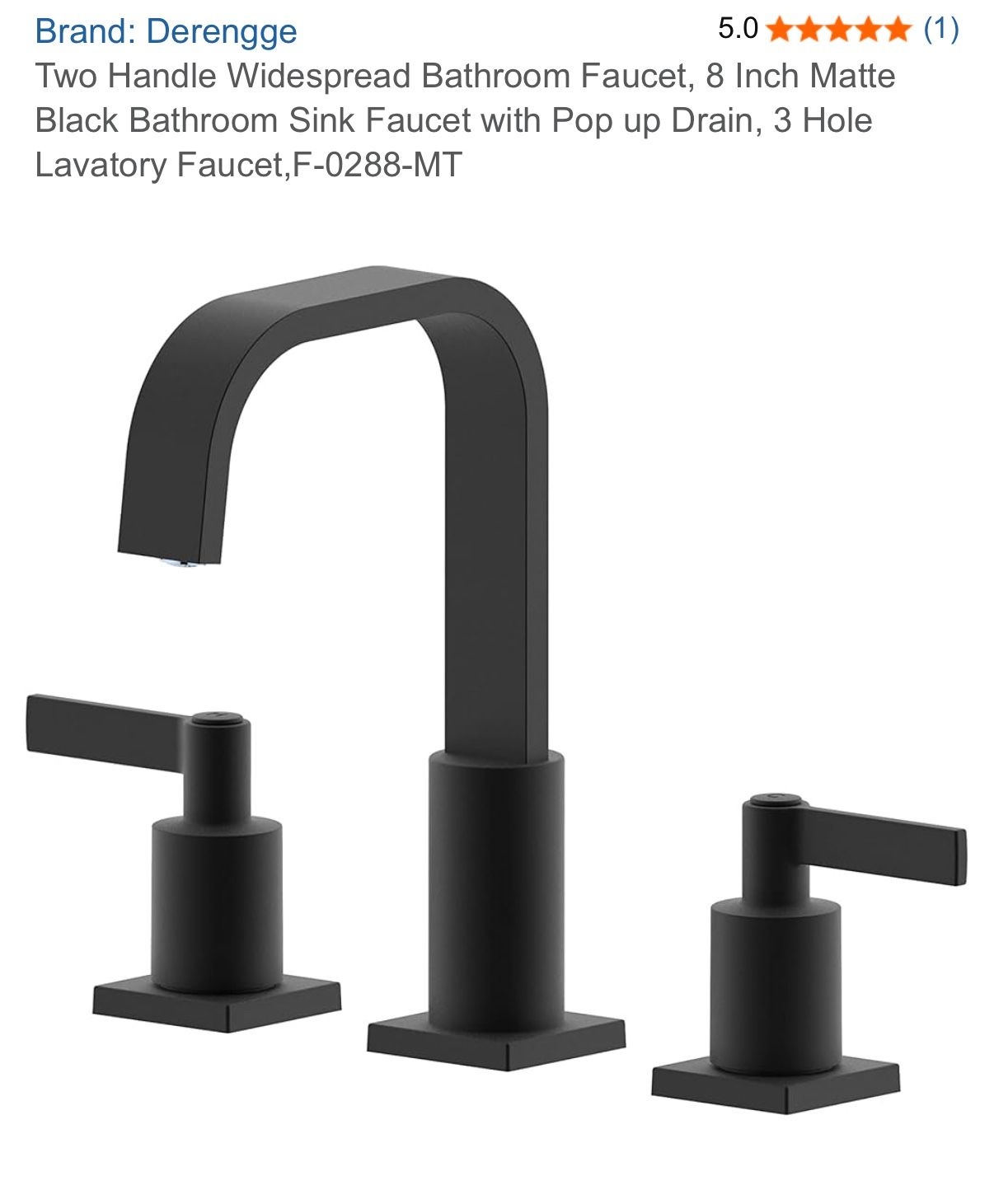 New matte black bathroom faucet. Derengge brand, two handle widespread design. It is 8 inch, 3 hole lavatory faucet and has a pop up drain. Still in box, never installed.