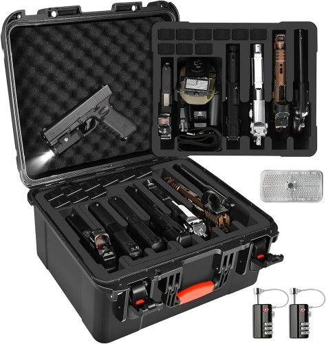 This is a Lugecase brand gun case. It can fit 7 pistols, 9 magazines. It comes with locks. It is modular, inserts can be added/removed for customized fit. It can fit pistols with some attachments still attached. This went for $110 on Amazon. This is brand new, never used, still in package. Cash only. Pick up in Westchester, Ladera Heights area. Serious offers considered. If this post is up, it is available.