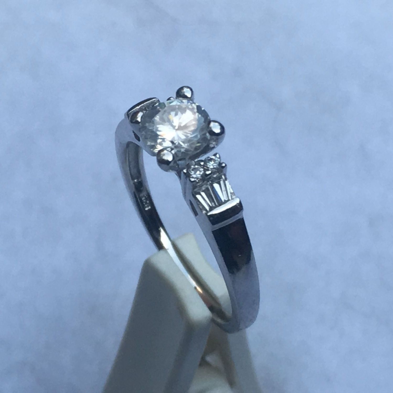 Sterling silver solitaire cubic zirconia engagement ring with beautiful sparkling side accents in size 7. This lovely ring has a larger 6 mm round center stone along with smaller round and baguette CZ stones sitting on each side of the main stone which adds to its beauty and charm. This ring really sparkles in the sunlight and a great ring for travel or everyday wear so you can keep you expensive diamond's safe from loss or damage. Love the look and sparkle of diamonds but want to pay a fraction of the price? Looking for something unique and different for your jewelry collection that is both beautiful and high quality, and something you would be proud to wear? Cubic Zirconia's set on silver jewelry make a beautiful combinations. This beautiful ring will surely get noticed when worn and unlike most items sold nowadays quality jewelry can last a lifetime! This is a higher quality jewelry with makers mark and 925 stamp on the inner band. Click on our profile pic to see more items like this or 100s of other great hard to find collectible items we have for sale, including silver and amber jewelry, disney items, original artwork, vintage and collectibles, and lots more!