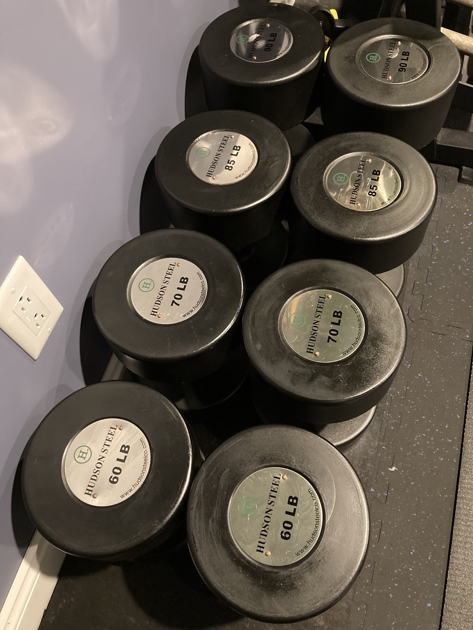 OPEN TO OFFERS ON INDIVIDUAL PAIRS. Commercial quality dumbbells. Built to last a lifetime. 2 x 60 lbs - $360 2 x 70 lbs - $420 2 x 85 lbs - $510 2 x 90 lbs - $540 Or $1,650 for all four pairs. Perfect for your home gym when included in your weight training / exercise regimen. Retails for over $3,500 new for the four pairs. Weight plates, bumper plates, heavy duty, dumbell, dumbbell, hex