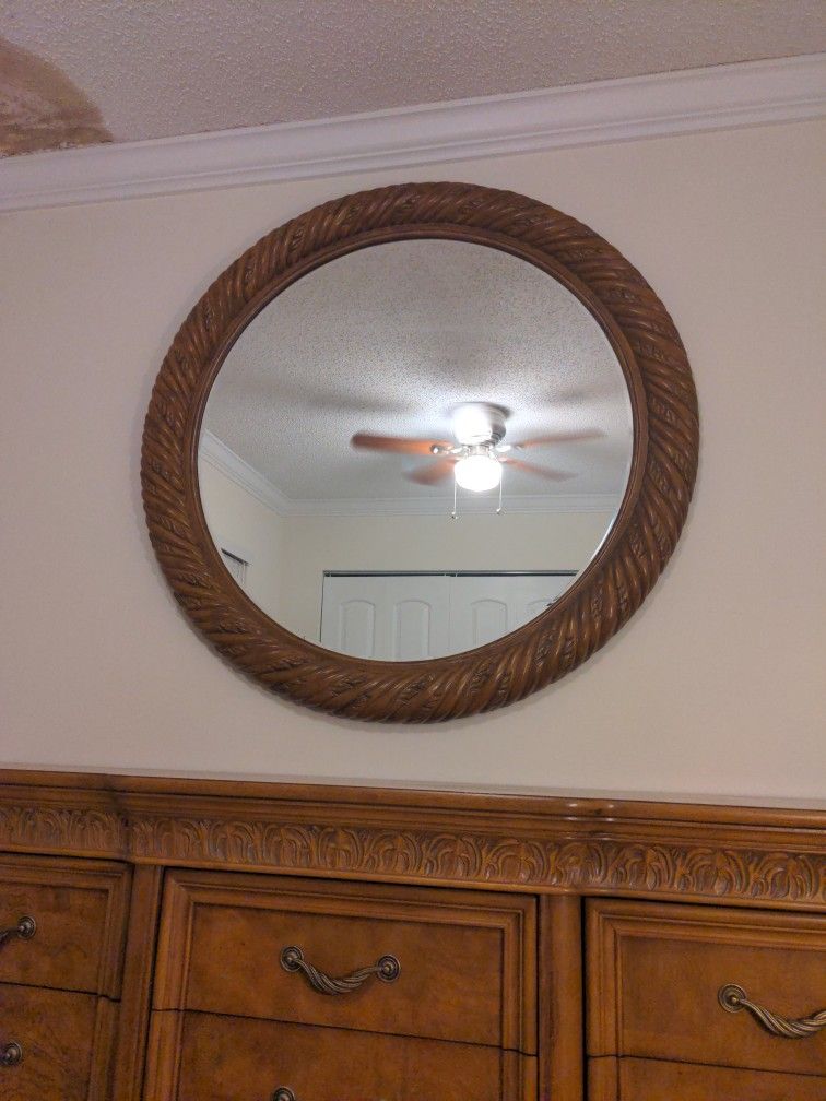 Solid mahogany framed mirror. Looks great. 45 inch diameter with frame, 35 inch diameter for mirror. ( 45 inches by 45 inches with frame, visible mirror is 35 inches by 35 inches. )