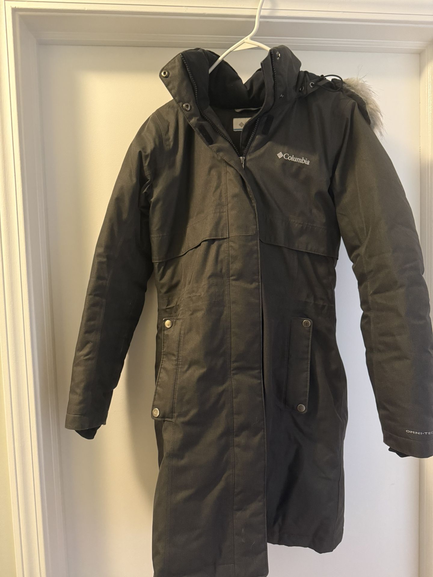 Size small with fur lined hood. Water repellant. Charcoal color. Some wear along cuff and arm. Omni heat technology and down to keep you warm. Current model: Apres arson ii winter long down jacket. Sells for $300 new. Maximum warmth.