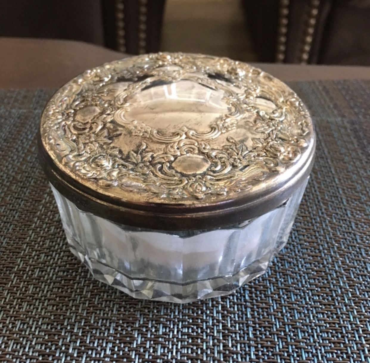 Silver Plate Metal Lid On Clear Powder Box With Powder Puff