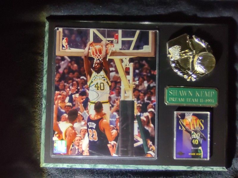 Shawn Kemp autographed Dream Team II plaque – CLEAN Sonics collectors piece! Hand-signed in bold black Sharpie by Reign Man himself Official NBA hologram on the photo (serial #0(contact info removed)95 – 100% verifiable on https://offerup.com/redirect/?o=TkJBLmNvbQ==) Iconic 8x10 dunk photo in the classic white Sonics home jersey Custom green-marble plaque with engraved brass plate that reads “SHAWN KEMP – DREAM TEAM II 1994” Comes with a 1994 SkyBox “Reign Man” card and gold basketball medallion Ready-to-hang, glass front, approx 16″×20″ overall Mint condition – stored away from sunlight, signature is perfect This is the real deal with the original NBA authentication (not a private signing sticker). Dream Team II stuff almost never shows up signed, especially framed this nice. Asking $225 or best reasonable offer – cash/Zelle. Located in Edmonds– can meet in a public spot. First come, first served – will NOT hold without a deposit. Message me if you want it on your wall for Christmas!