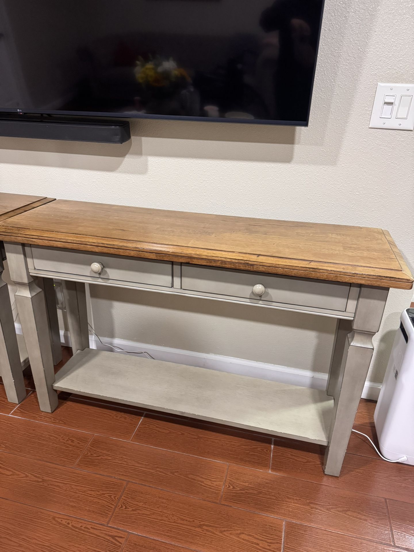 Used 48” Console Table. Color grey with brown top. Purchased from Wayfair for $369. Minor scapes as pictured. It also has two drawers. Smoke free home. I have 2 tables, but I am selling them separately. This is the price of ONE console table. Measurements are shown in picture. Pick up in Riverside 92503.